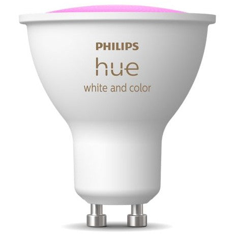Philips Hue White and Color ambiance GU10. Typ: Intelligenter Einbaustrahler. Produktfarbe: Weiß. Leuchtmitteltyp: LED. Unterstützte mobile Betriebssysteme: Android. iOS. Energieeffizienzklasse: E. Energieverbrauch pro 1.000 Stunden: 5 kWh. Energieeffizienzskala: A bis G. Breite: 50 mm. Tiefe: 50 mm. Höhe: 57 mm. Verpackungsart: Box. Verpackungsbreite: 72 mm. Verpackungstiefe: 72 mm