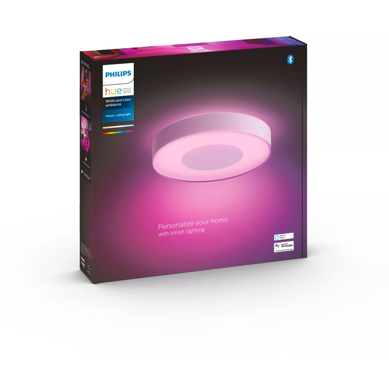 Philips Hue White and Color ambiance Infuse Deckenleuchte L weiß. Typ: Intelligente Deckenbeleuchtung. Schnittstelle: Bluetooth/Zigbee. Produktfarbe: Weiß. Unterstützte mobile Betriebssysteme: Android. iOS. Energieeffizienzklasse: G. Energieverbrauch pro 1.000 Stunden: 54 kWh. Eingangsspannung: 50–60 Hz. Breite: 425 mm. Tiefe: 425 mm. Höhe: 86 mm. Verpackungsart: Box. Verpackungsbreite: 476 mm. Verpackungstiefe: 502 mm
