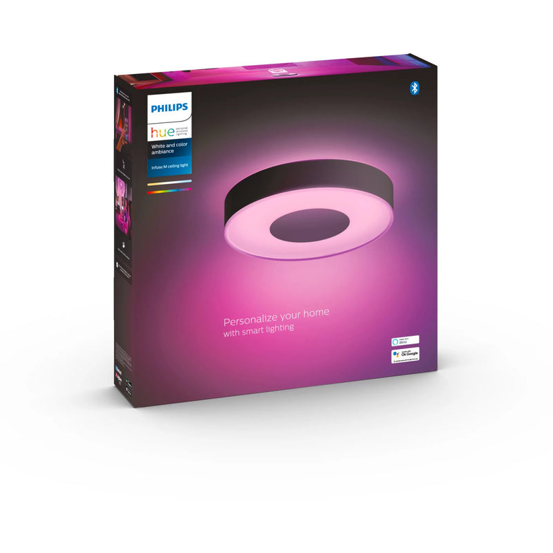 Philips Hue White and Color ambiance Infuse Deckenleuchte M schwarz. Typ: Intelligente Deckenbeleuchtung. Schnittstelle: Bluetooth. Produktfarbe: Schwarz. Energieeffizienzklasse: G. Eingangsspannung: 50–60 Hz. Spannung: LED. Breite: 381 mm. Tiefe: 381 mm. Höhe: 86 mm. Verpackungsbreite: 437 mm. Verpackungstiefe: 457 mm. Verpackungshöhe: 100 mm. Menge pro Packung: 1 Stück(e)