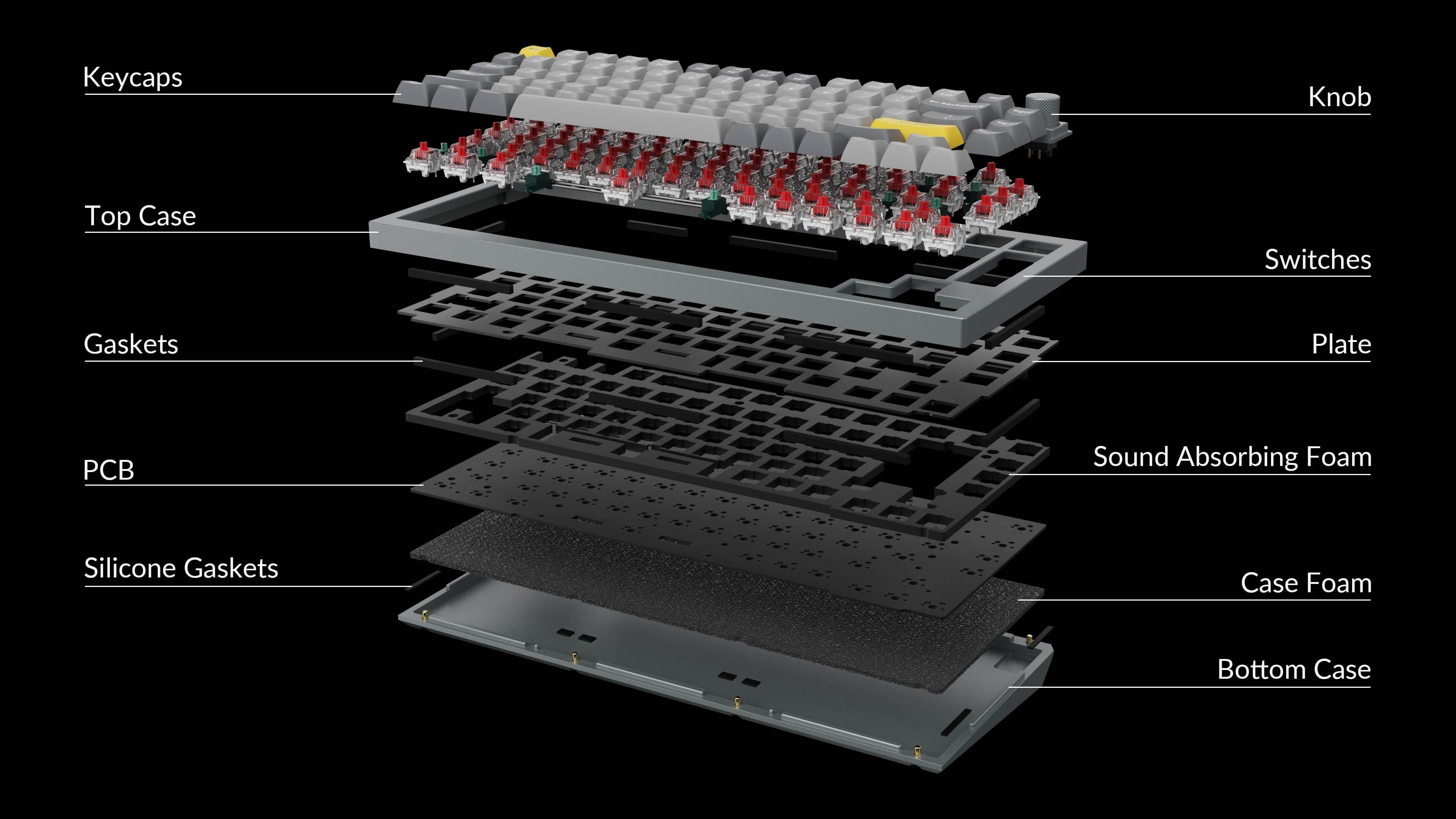 Ein weiterer Höhepunkt ist das durchdachte Double-Gasket Design. Hier kommen zusätzliche Silikondichtungen zwischen dem oberen und unteren Gehäuse zum Einsatz, um ein verbessertes Geräuschprofil zu schaffen. Die Keychron Q1 besteht aus einem hochwertigen CNC-gefrästen 6063-Aluminium-Gehäuse, das durch 24 aufwendige Prozesse wie Polieren, Eloxieren und Sandstrahlen geht. Das dazugehörige dichtungsmontierte Design ermöglicht nicht nur eine angenehme Flexibilität von bis zu 2,5 mm, sondern sorgt auch für einen ausgezeichneten Klang beim Tippvorgang.