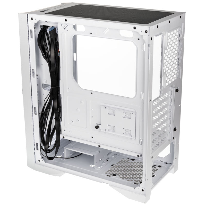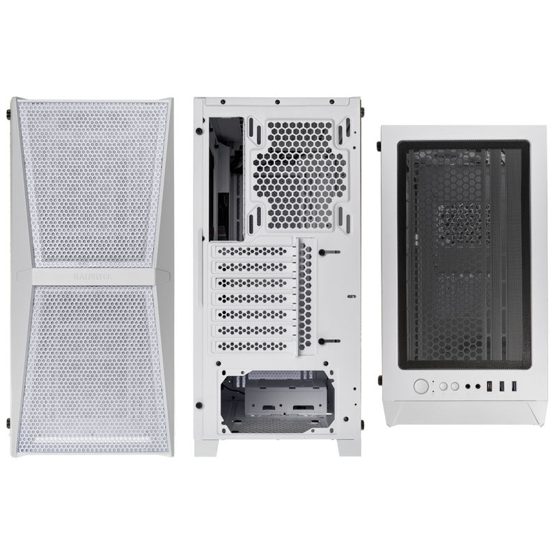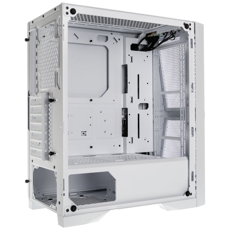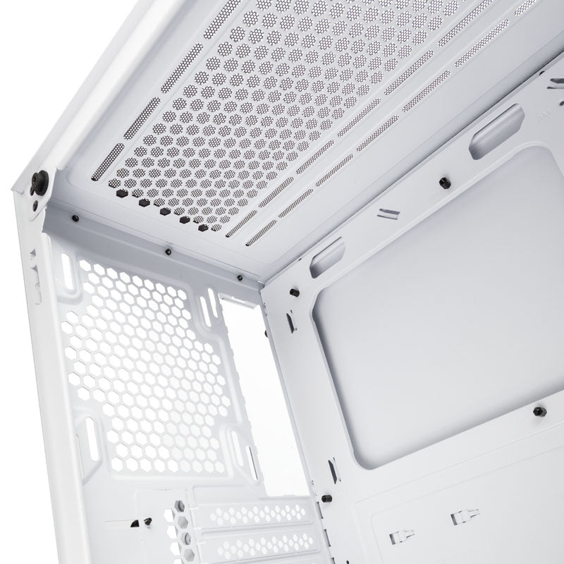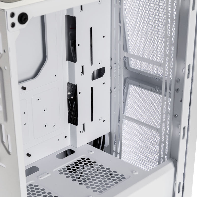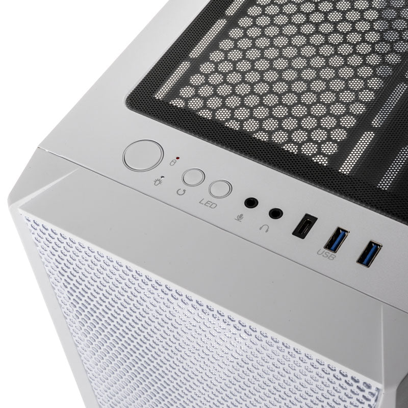 Edler Midi-Tower in Weiß, großflächiges Mesh an der Front, Seitenteil aus Hartglas, Mainboards bis ATX-Formfaktor, umfangreiche Luft- oder Wasserkühlung möglich