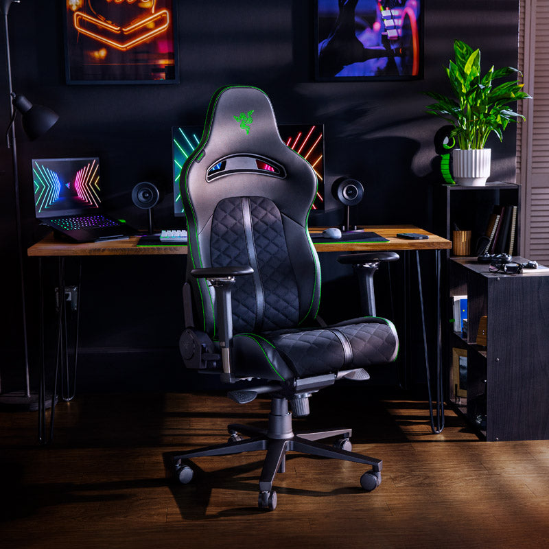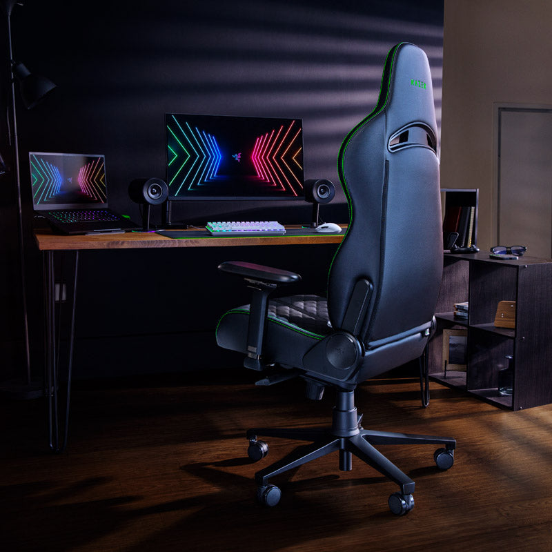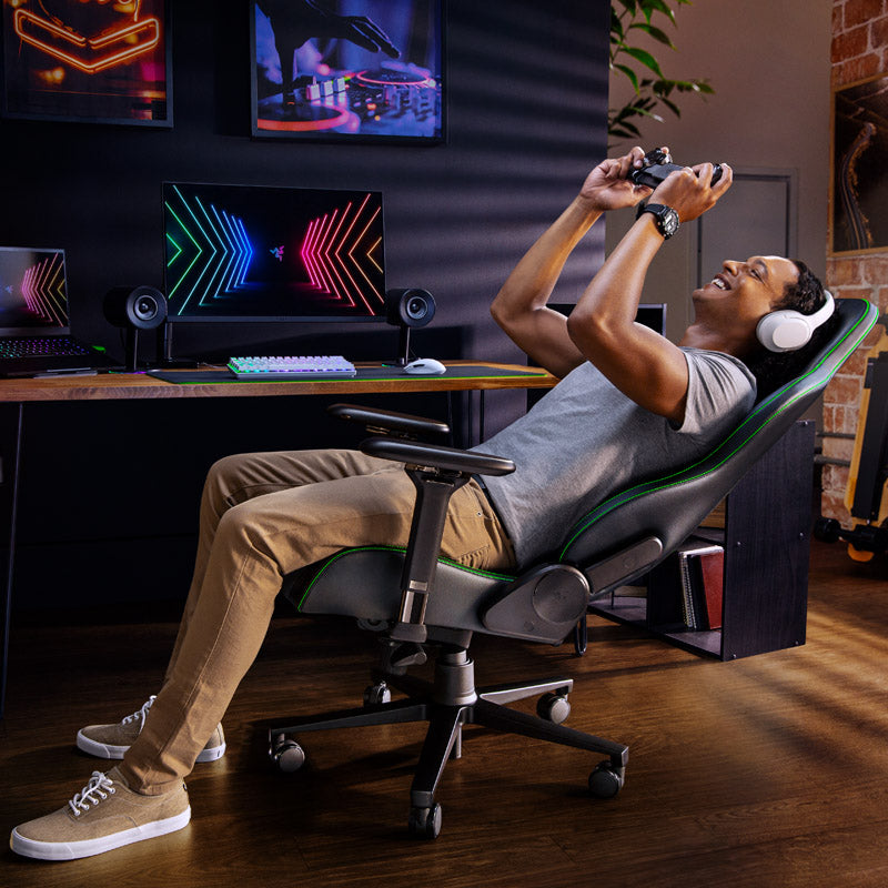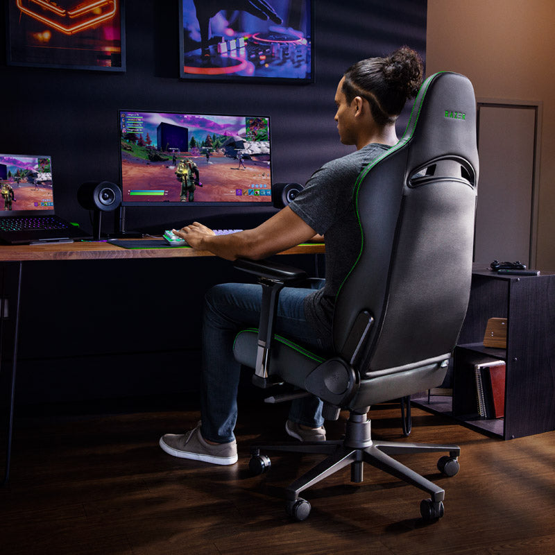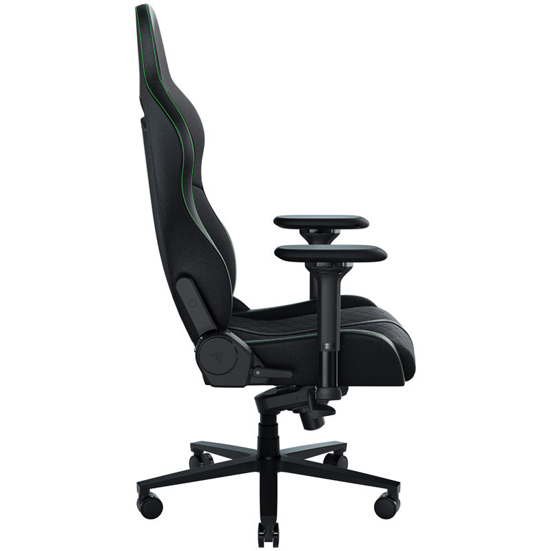 Bequemer Gaming Stuhl in Schwarz mit grünen Details, ausgelegt für tägliche Nutzung, Bezug aus Stoff & Kunstleder, integrierte Rückenstütze, 4D-Armlehnen, Maximalbelastung bis zu 136 kg