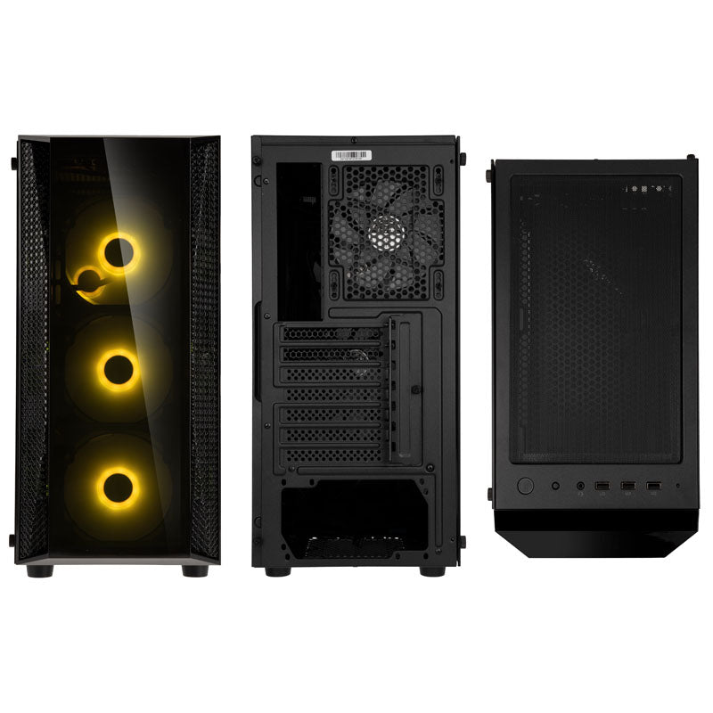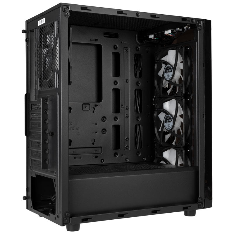 Edles Design-Gehäuse mit gutem Airflow, Seitenteil und Front aus Tempered Glass, für Mini-ITX-/Micro-ATX-/ATX-Mainboards, mit Netzteilabdeckung, mit 4 vorinstallierten 120er-ARGB-Lüfter samt Controller, Platz für ein 280er- und ein 240er-Radiator