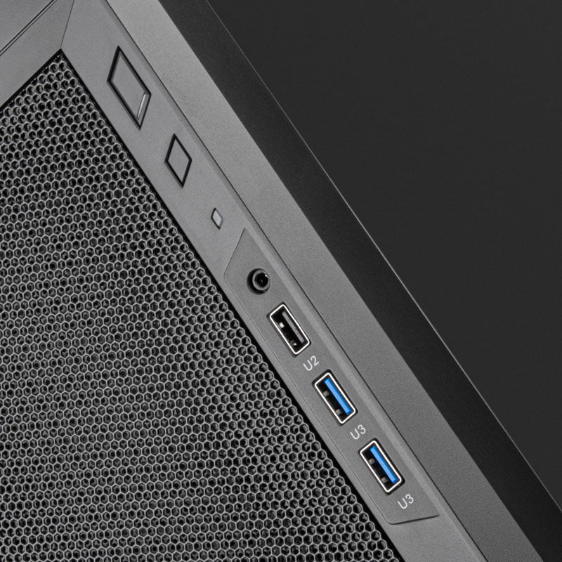 Stilvolles Micro-ATX-Gehäuse mit gutem Airflow, mit luftdurchlässiger Mesh-Front, ein vorinstallierter 120-mm-Lüfter, Grafikkarten bis 354 mm und CPU-Kühler bis 156 mm, I/O-Panel mit 2x USB 3.0 und 1x USB 2.0