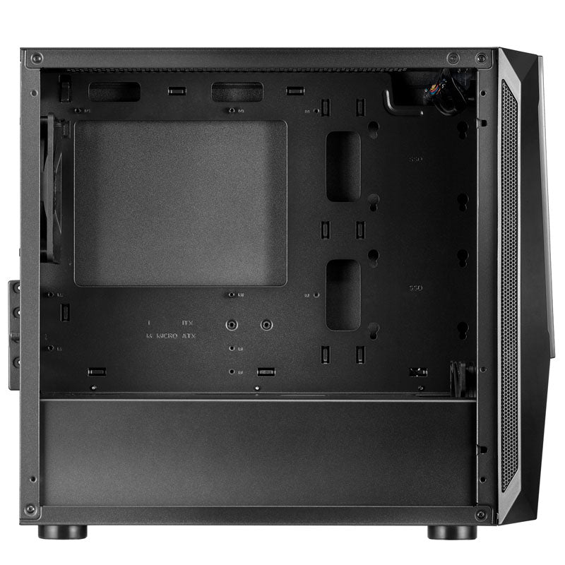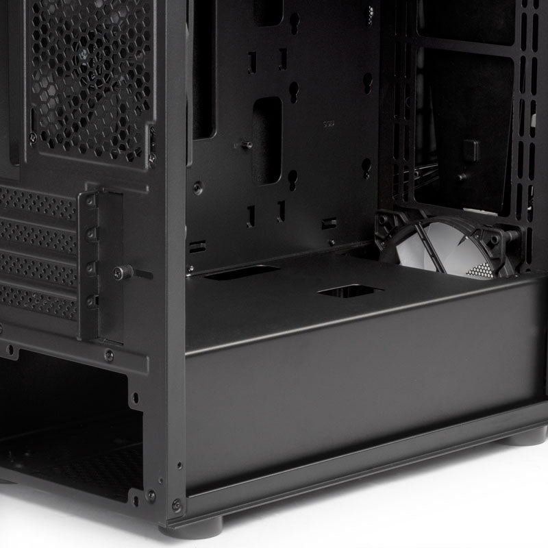 Mini-Tower mit ARGB, insgesamt fünf Lüfter möglich, max. 280-mm-Radiatoren, Grafikkarten bis 379 mm, zwei 120-mm-Lüfter vorinstalliert, vier Festplatten möglich, USB am I/O-Panel: 2x 3.0, 2x 2.0