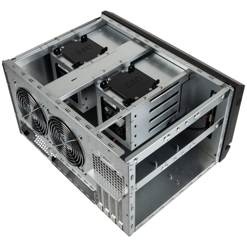 Kompaktes Micro-ATX-Gehäuse von SilverStone, 8x Hot-Swap-fähige 2,5/3,5-Zoll-Slots (extern), 4x 2,5-Zoll-Slot (intern), 2x 120-mm-Lüfter vorinstalliert, 4x Erweiterungsslots