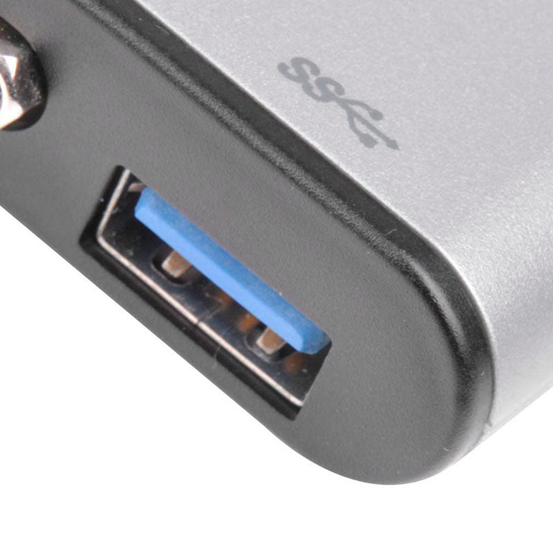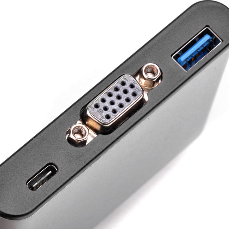 USB-Hub mit USB 3.2 Gen 1 (max 5. Gbit/s), USB 3.0 Typ A, USB 3.0 Typ C, VGA-Anschluss, unterstützt Datenraten von 2,7 Gb/s (HBR) und 1,62 Gb/s (RBR) pro Leitung