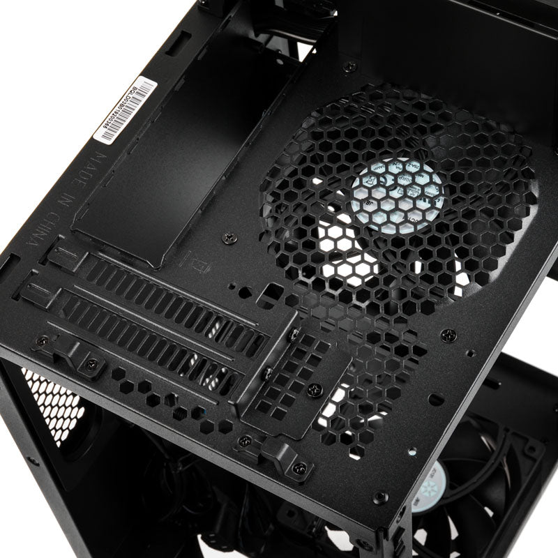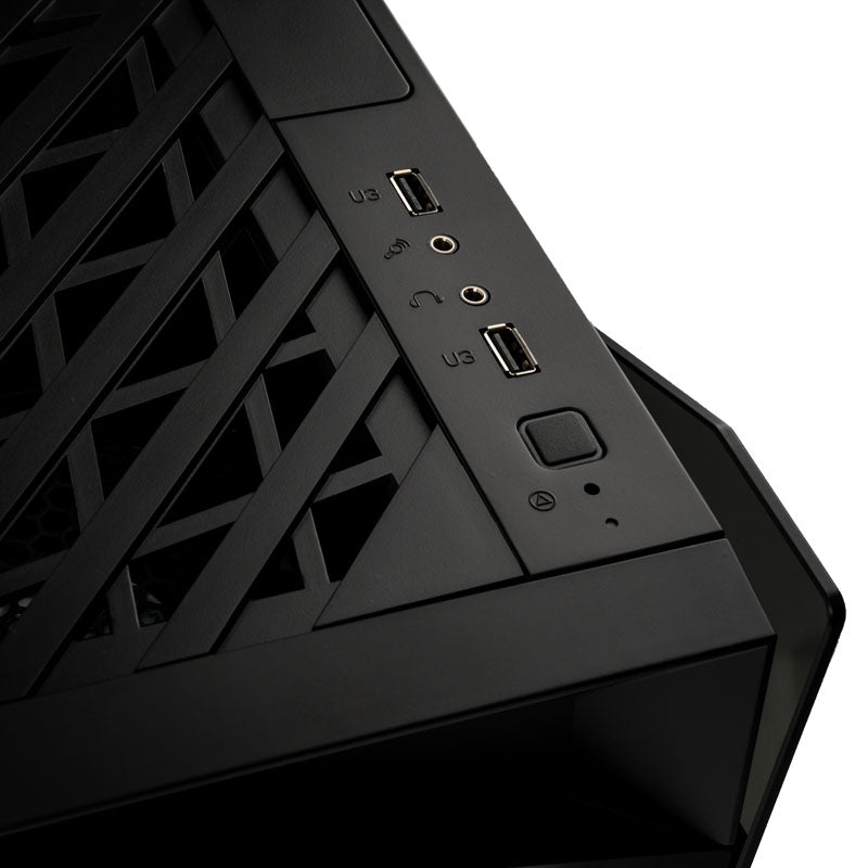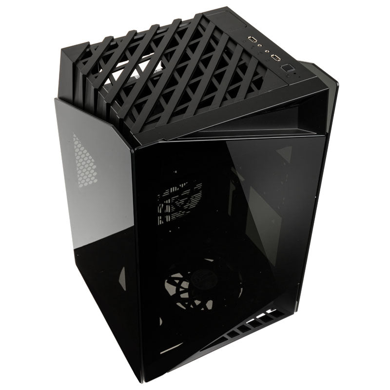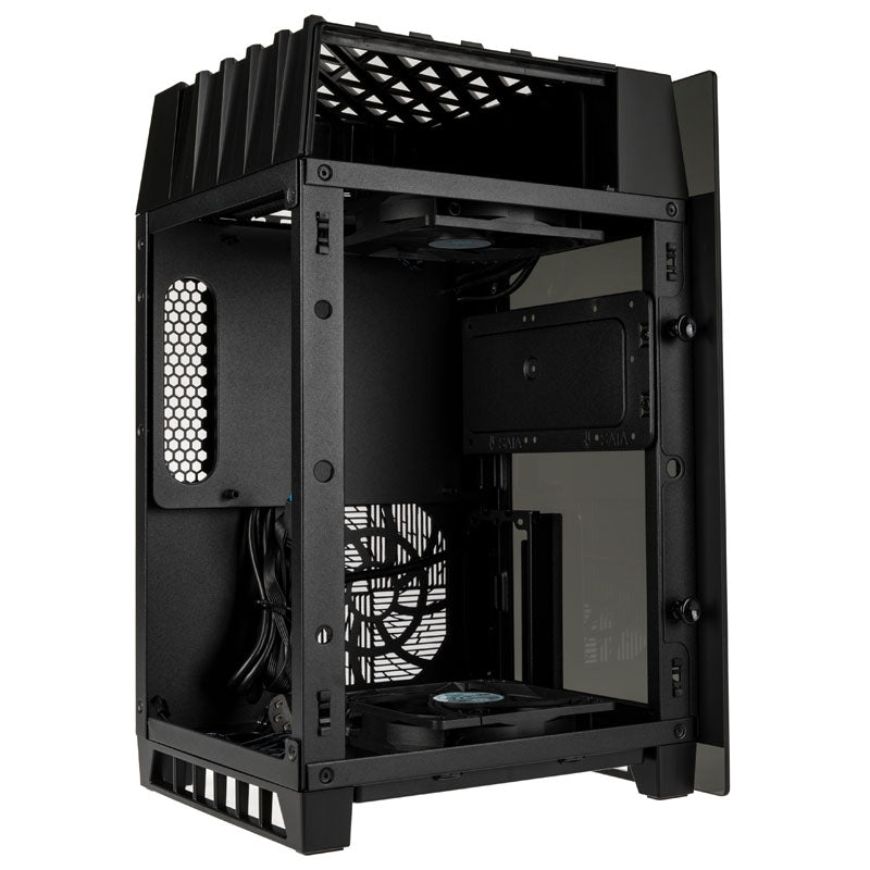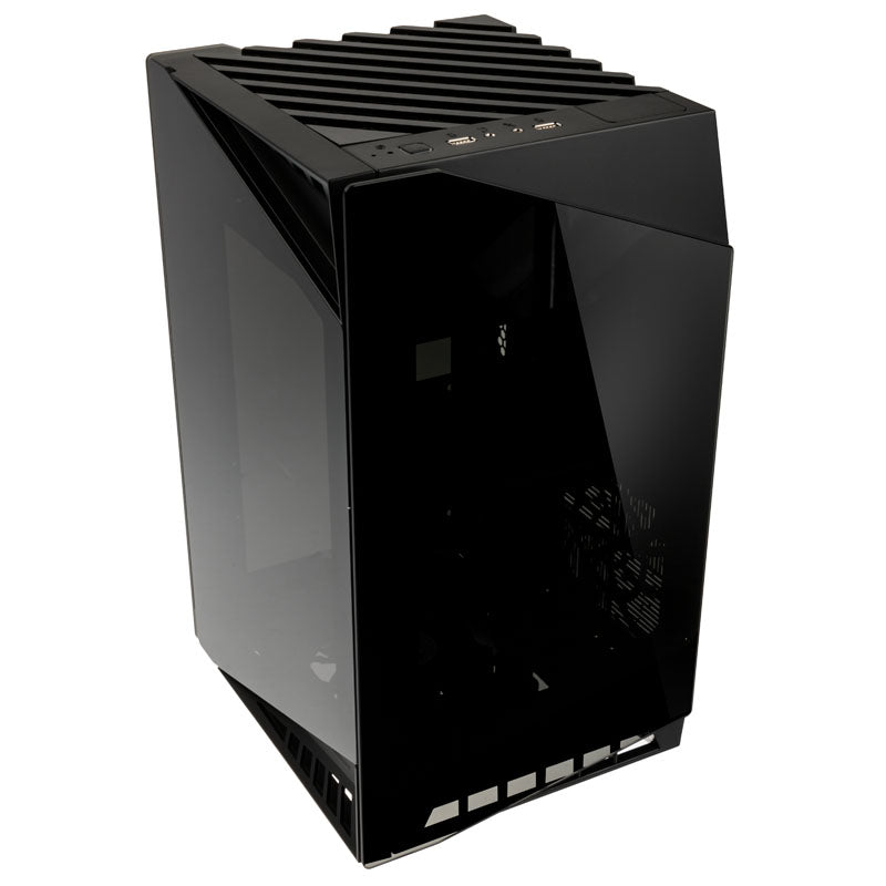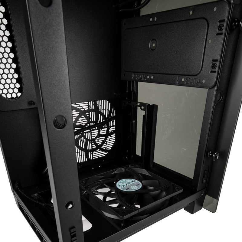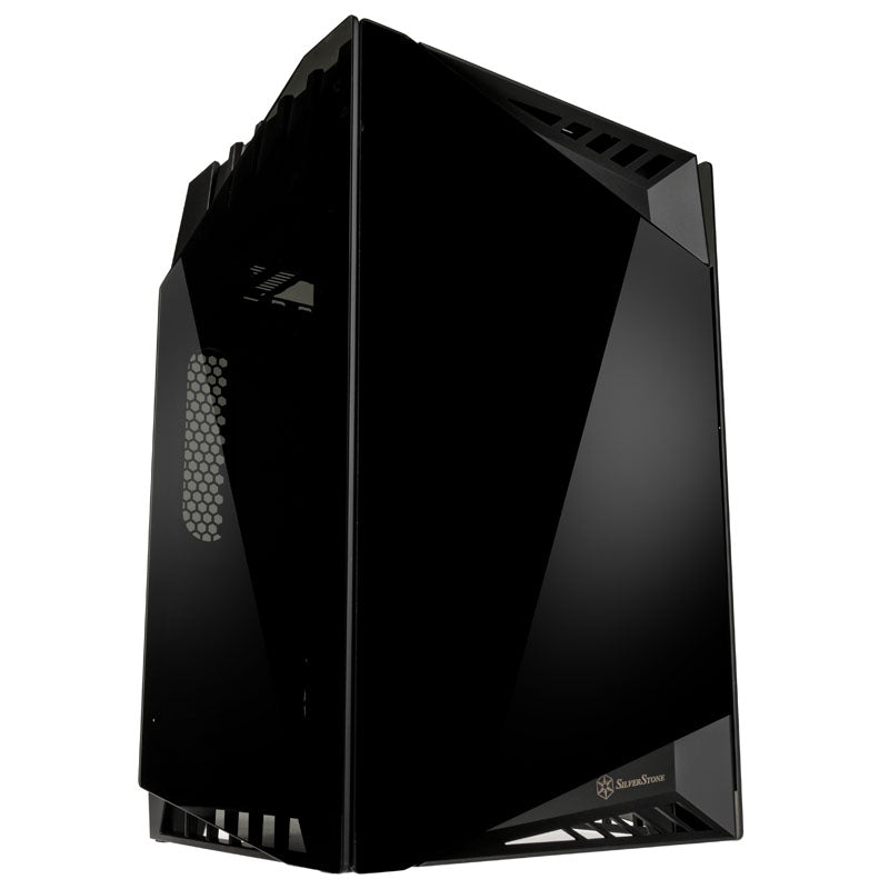 Mini-ITX-Gehäuse von SilverStone in Schwarz, mit getöntem Tempered Glass und Panoramablick auf die Hardware, um 90 Grad gedrehtes Mainboard-Tray, vertikale Montage der Grafikkarte, 2x USB 3.0 & HD-Audio