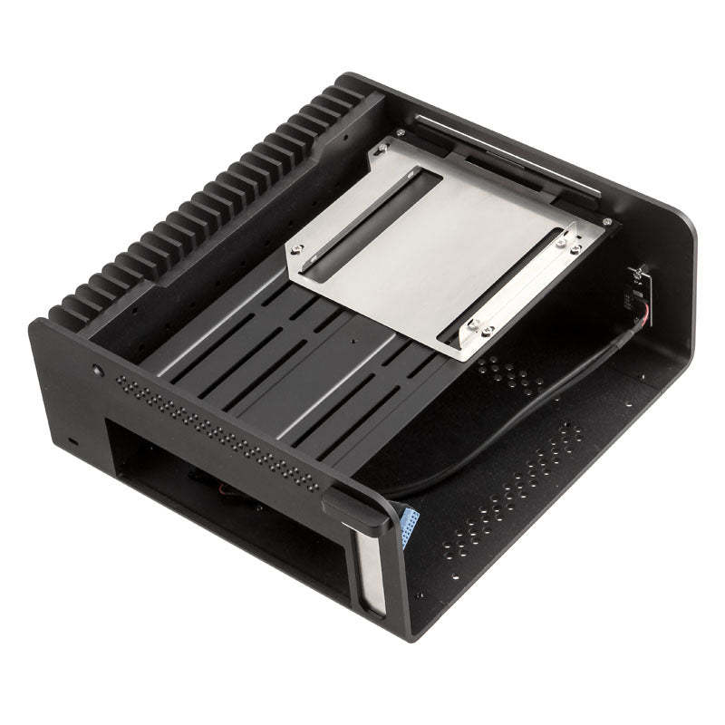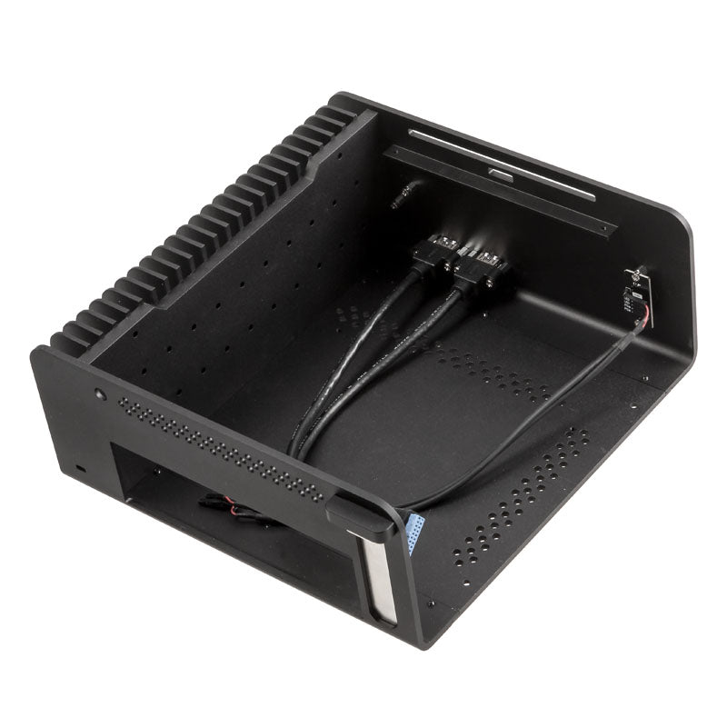 Praktisches Bundle aus Streacoms passiv gekühltem Full-ATX-Aluminium-Case in Schwarz mit verändertem Design und einem 160-Watt-Netzteil für lautlose HTPCs