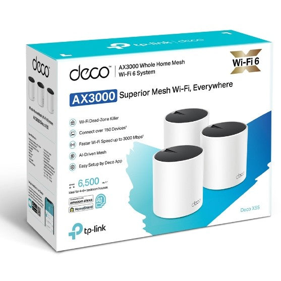 TP-Link DECO X55 (3-Pack). Produktfarbe: Weiß. Antennentyp: Intern. Produkttyp: Mesh-Router. WLAN-Band: Dual-Band (2.4 GHz/5 GHz). Top WLAN-Standard: Wi-Fi 6 (802.11ax). WLAN Datentransferrate (max.): 3000 Mbit/s. Prozessor-Taktfrequenz: 1 GHz. Firewall: SPI Firewall. Sendeleistung (CE): 20 - 23 dbm. Konformitätsbescheinigungen: CE. RoHS. Zertifizierung: CE. FCC. RoHS. RCM. Breite: 110 mm. Tiefe: 110 mm. Höhe: 114 mm