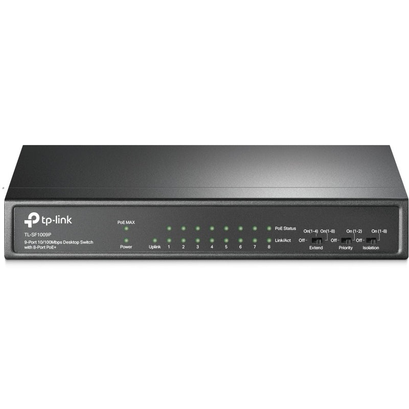 TP-Link 9-Port 10/100Mbit/s-Desktop-Switch mit 8 PoE+-Ports. Switch-Typ: Unmanaged. Basic Switching RJ-45 Ethernet Ports-Typ: Fast Ethernet (10/100). Anzahl der basisschaltenden RJ-45 Ethernet Ports: 9. Vollduplex. MAC-Adressentabelle: 2000 Eintragungen. Routing-/Switching-Kapazität: 1.6 Gbit/s. Netzstandard: IEEE 802.3af. IEEE 802.3at. IEEE 802.3i. IEEE 802.3u. IEEE 802.3x. DC input Spannung: 53.5 V. Netzstecker: DC-Anschluss. Power over Ethernet (PoE). Wandmontage