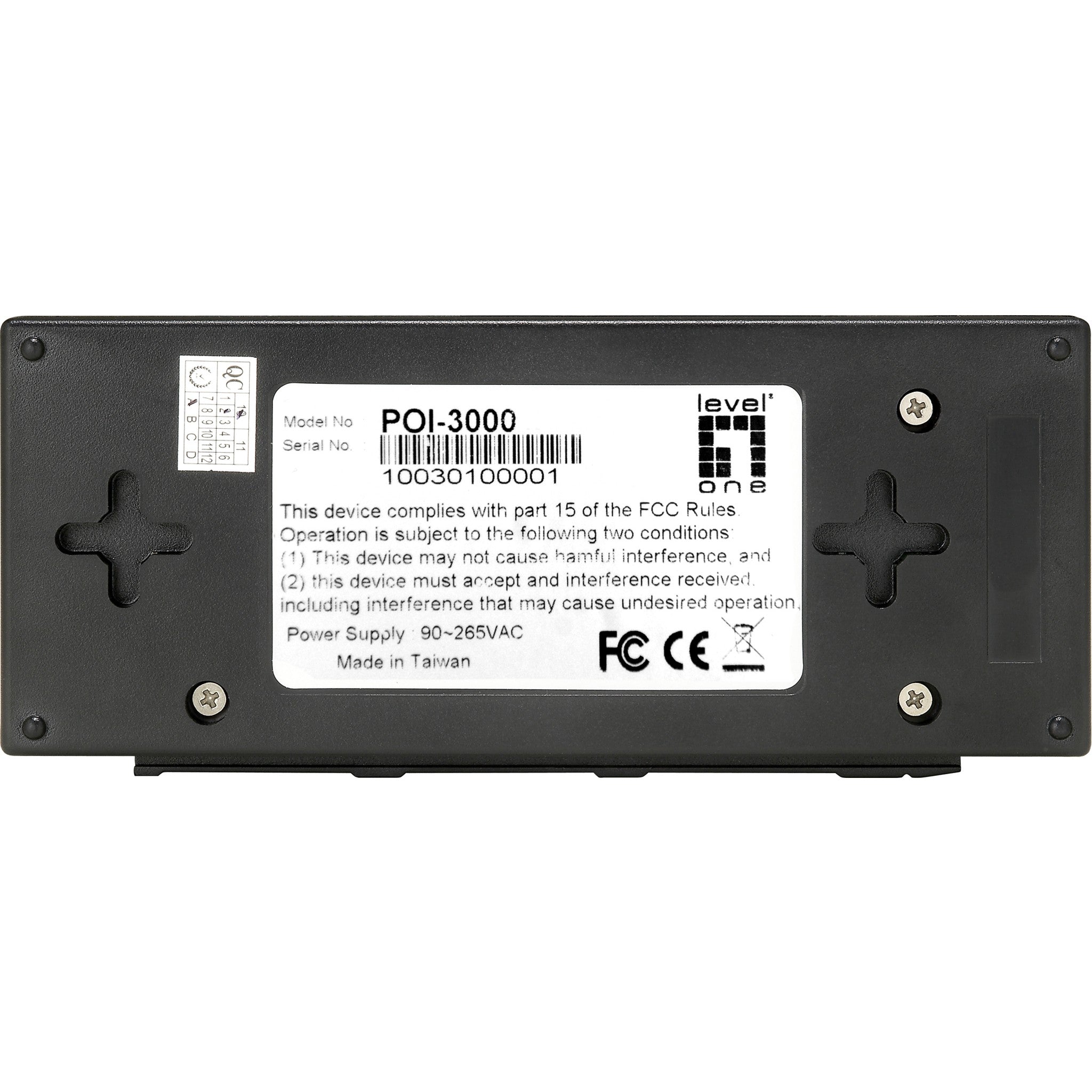 LevelOne Gigabit PoE+ Injektor. Ethernet Schnittstellen Typ: Gigabit Ethernet. Ethernet LAN Datentransferraten: 10.100.1000 Mbit/s. Produktfarbe: Schwarz. LED-Anzeigen: PoE. Leistung. Ausgangsleistung: 30 W. Netzteil Eingansgsspannung: 100 - 240 V. Netzteilfrequenz: 50/60 Hz. Zertifizierung: RoHS Compliant. CE/FCC. Breite: 55 mm. Tiefe: 35.5 mm. Höhe: 173.5 mm